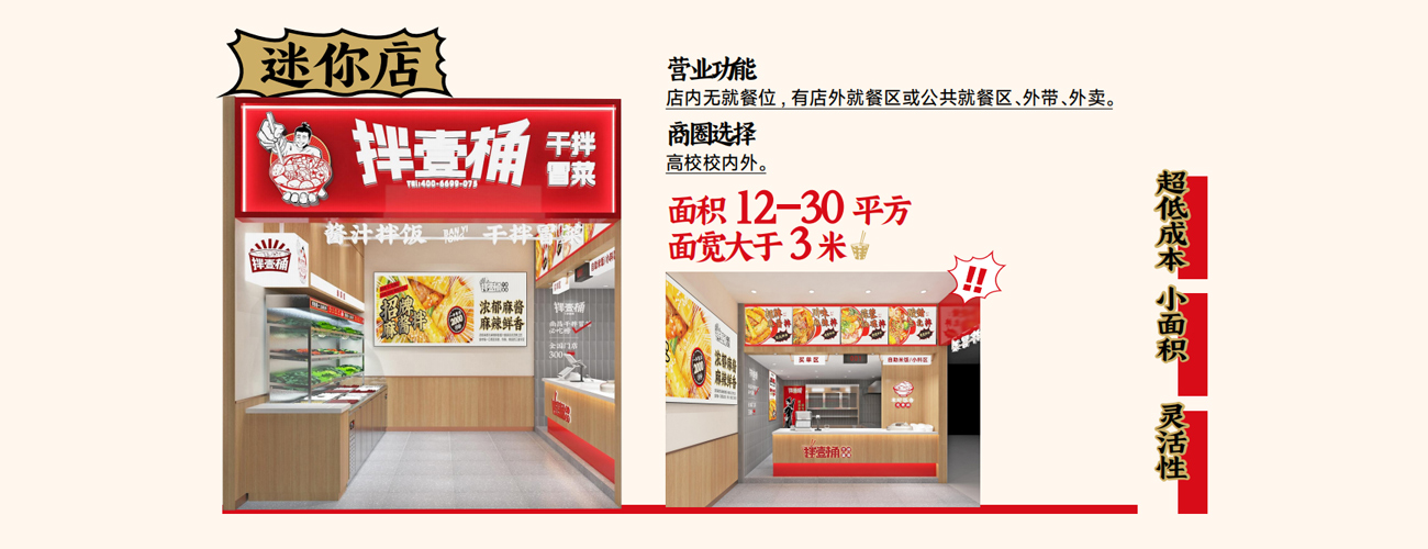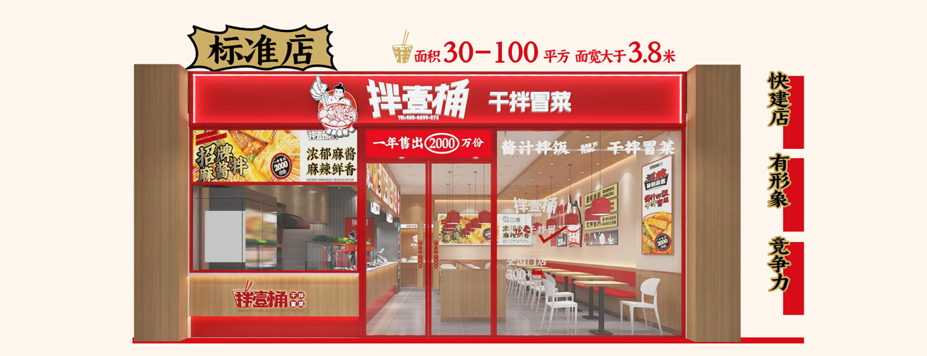 拌壹桶干拌冒菜創始于2019年,現已累計開出400+門店,覆蓋18省、自治區100多家城市。創立6年堅持以[讓國人吃到好吃、干凈、新鮮的冒菜】的形式, 打開中國乃至全球冒菜市場。拌壹桶干拌冒菜--2019至今,喜愛拌壹桶的消費者涵蓋小孩兒、大學生、上班族、熱愛吃喝的大人們。品牌初衷不變--用心、專注、踏實地為顧客提供美食,放肆吃喝放肆嗨。